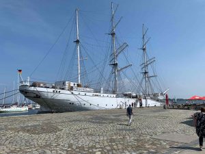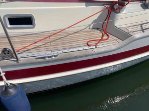 Böiger Wind beim Anlegen in Stralsund führten zu zwei dicken Kratzer an der Kiss of Life. Endlich Festgemacht kam der Hafenmeister mit dem Worten: „Hier könnt ihr nicht liegen, nur Boote ab 15m“. Ich war gewillt meinen Bootshaken vorne ans Boot zu montieren, so das ich die 15 Meter erfüllt hätte, entschied mich jedoch nochmal zum Wechsel. Diesmal ohne Schaden.