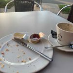 9.00h Sonnenaufgang. Hier im Westen fängt der Tag etwas später an, dauert dafür länger. Das zweite Bild zeigt Das Ende eines französischen Frühstücks. Zwei Croissant, Cappuccino, Butter und Marmelade für gerade mal 3,00 EUR inklusive Ausblick!