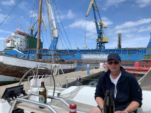 Wind Anfangs gut aus W Stärke 2 (Raumer Wind), später dann von Hinten bei Stärke 1, Baum festgebunden, Fock eingeholt, dümpelten wir Richtung Warnemünde, 40 NM, 7 Stunden.