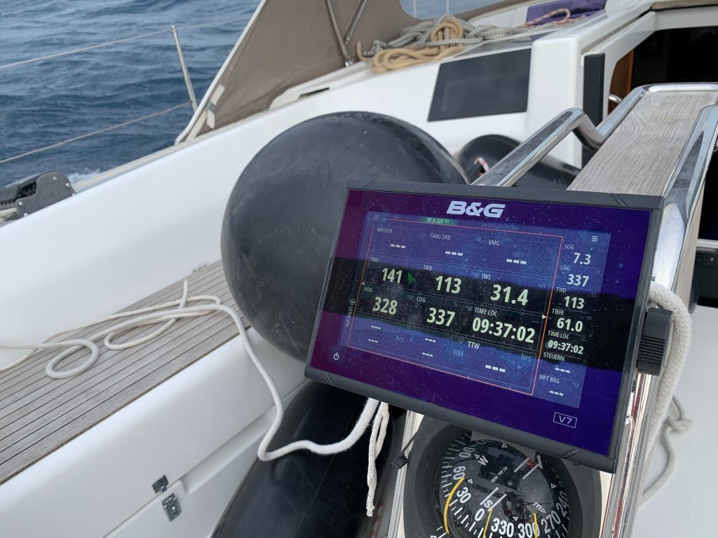 Es geschah bei raumen Wind und Welle schräg von hinten. Ich fuhr nur mit stark gerefften Groß, schlappe 7,3kn. Der Autopilot war eingeschaltet und ich genoss den herrlichen Morgen.