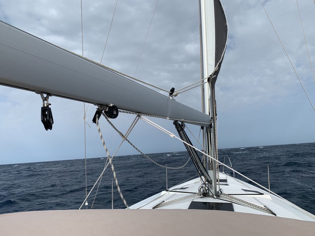 Auf einmal kam eine etwas größere Welle von hinten und drehte das Schiff längs zur Welle. Der Autopilot konnte nichts dagegenhalten. Dumm nur, dass sich das Boot auch mit dem Heck durch den Wind drehte. Ein Patenthalse wie sie im Buche steht. Ein lauter Knall und die Grossschot konnte den Baum nicht mehr halten. Sie riss und der Baum knallte in den Mittelstag.