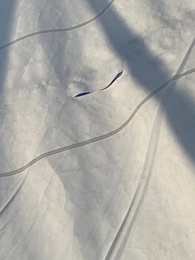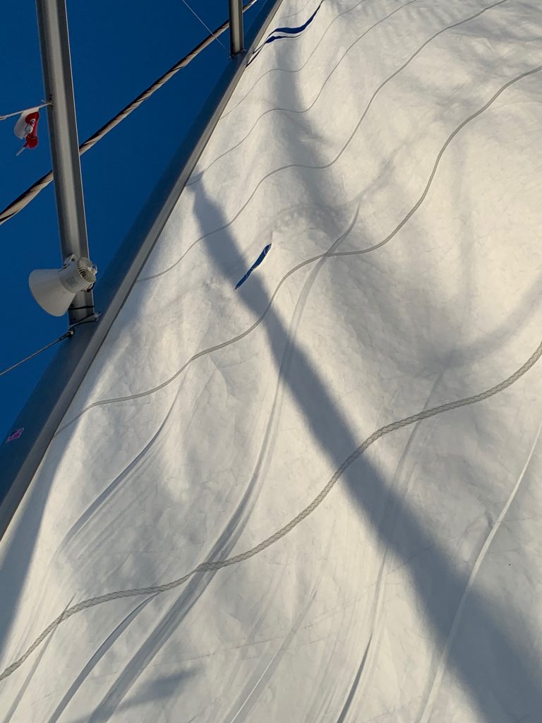 Windstille in der Marina! Super Segelkontrolle und siehe da, das Segel hat doch etwas abbekommen. Einen ca. 30 cm langen Riss!